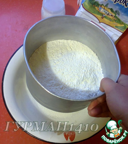 7. Теперь просеять сюда 500 грамм муки. ( В двухсот пятидесяти граммовом стакане – 160 грамм муки. Я брала 3 стакана муки + 1 ст. ложка муки без верха.)