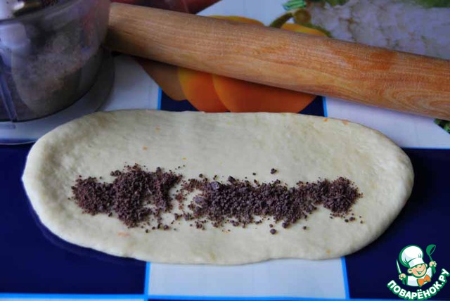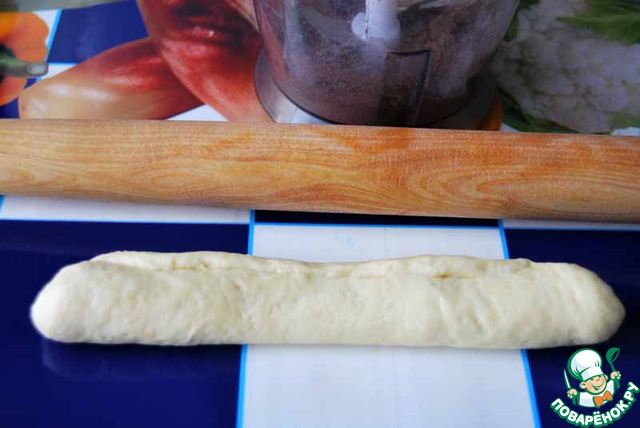 Берём кусочек теста и раскатываем его в широкую полоску. Если тесто липнет, присыпьте мукой.