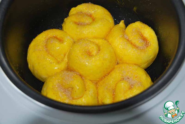Берём чашу мультиварки, смазываем маслом, укладываем в неё неплотно полуфабрикаты булочек-завитки.