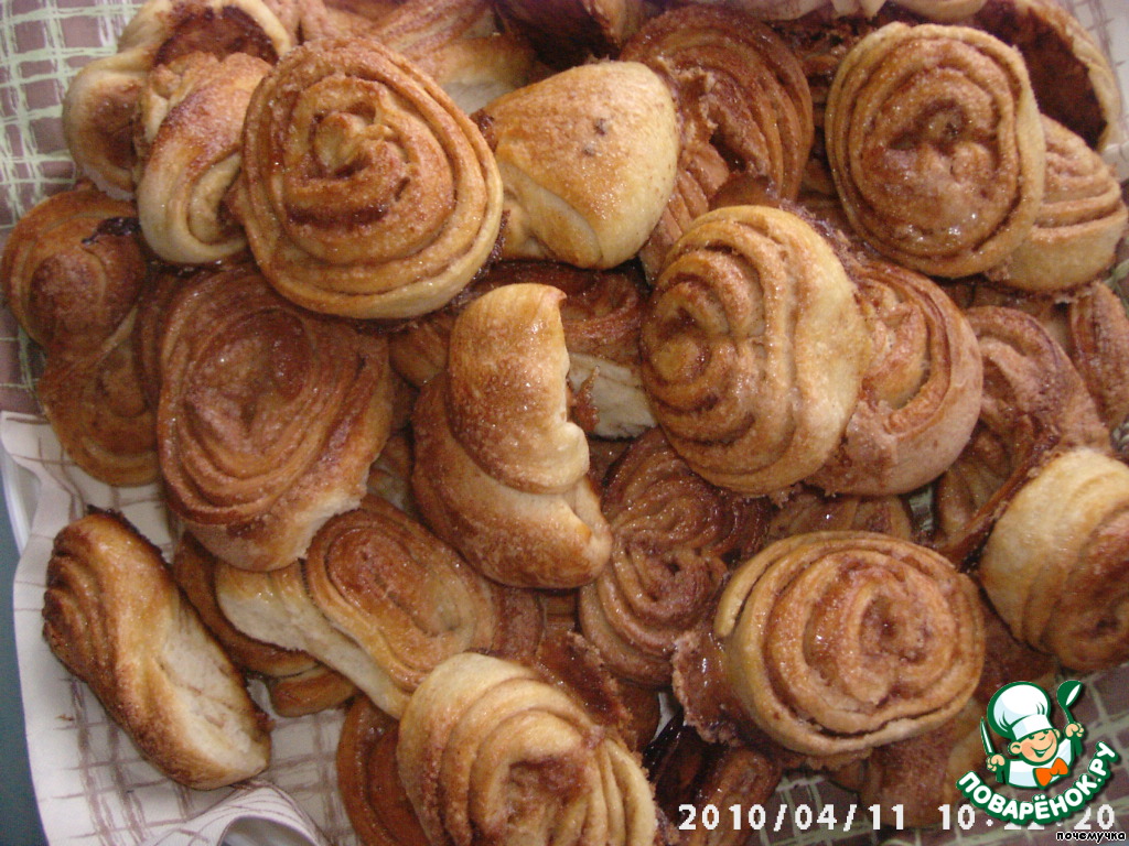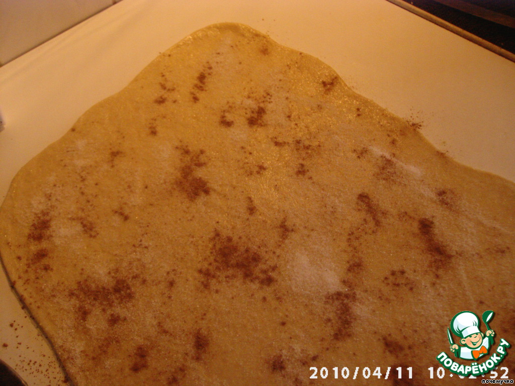 Смазать тесто маслом, посыпать сахаром и корицей. Свернуть в рулет, положить швом вниз.
