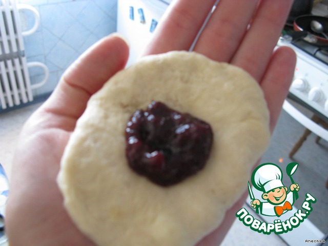 Джем смешать с 1 столовой ложкой муки (чтобы не растекался, на вкусе это никак не отразится). У меня был джем из черной смородины (ягоды, перетертые блендером с сахаром, пропорции не помню,делала по вкусу, чтобы не сильно кислый был). Шарик из теста растянуть на ладони, положить неполную чайную ложку джема, завернуть.