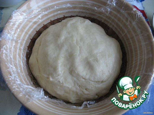 Еще раз хорошенько вымесить, тесто должно быть мягкое, эластичное и не прилипать к рукам. Положить в миску (можно выстелить ее пищевой пленкой, как у меня), накрыть салфеткой и оставить подходить в теплом месте на 40-60 минут.
