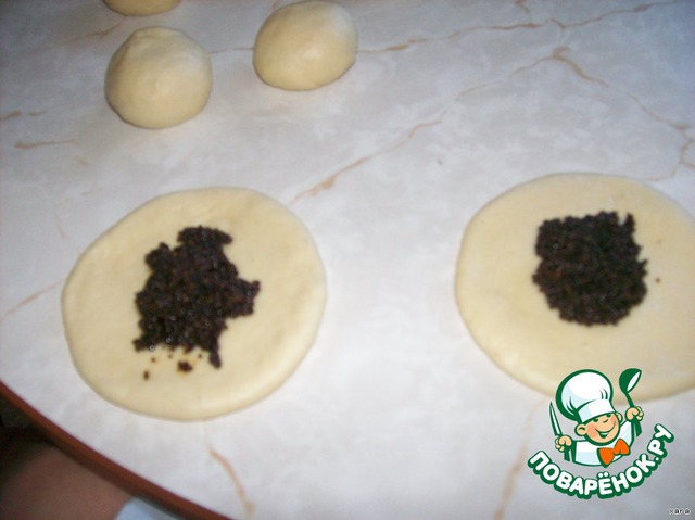 Булочки кладем на смазанный тонким слоем раст. масла лист на расстоянии 2,5-3 см друг от друга, расстаиваем 20-25 мин., смазываем разболтанным яйцом или льезоном.