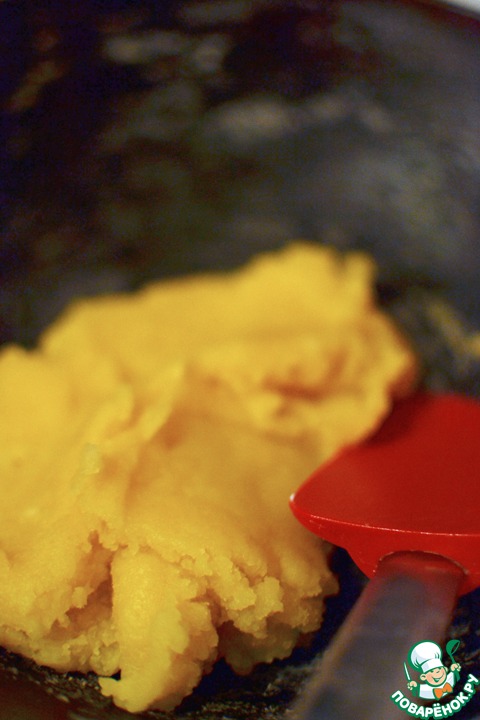 Всыпать в кипящую водно-масляную смесь сразу всю муку и убрать сотейник с огня. Быстро лопаткой замесить тесто.