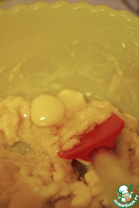 Пока тесто достаточно горячее, вмешать по одному три яйца.