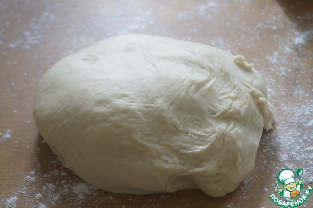 Готовое тесто достаем на рабочую поверхность подпыленную мукой.