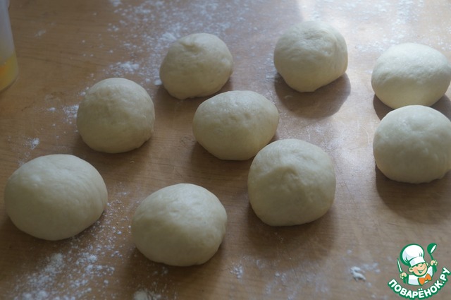Делим тесто примерно на 9-10 равных частей и скатываем каждую в шарик.