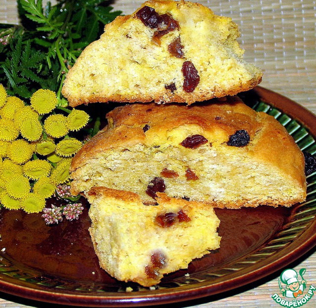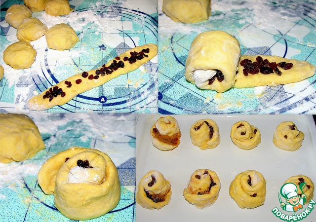 Сделала восемь больших булок. Тесто скалкой не раскатывала, а разравняла пальцами, положила в четыре изюм и в другие четыре изюм, корицу, сахар. Верх обычно смазываю яйцом или желтком. Эти булочки я не смазывала.