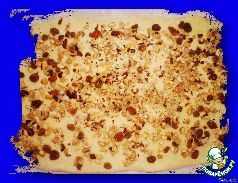 Разделим тесто на 2 части. Одна будет с маковой, вторая - с шоколадно-ореховой начинкой. Раскатаем одну часть в прямоугольник, посыпем орешками с изюмом и слегка вдавим их в тесто, чтобы при скручивании рулета они не трансформировались.