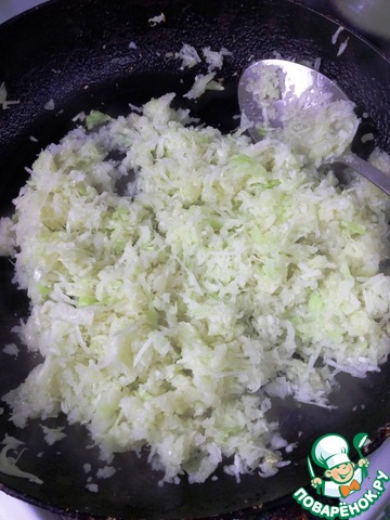 На сковороде разогреть масло, выдавить зубчик чеснока, выложить капусту и обжарить до мягкости 5-7 минут. Затем переложить на тарелку и дать остыть