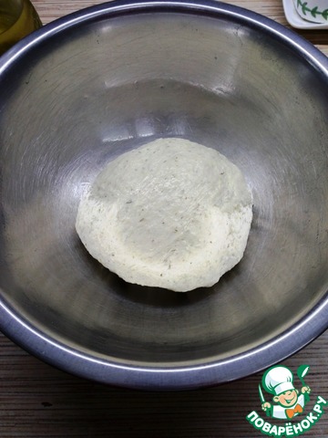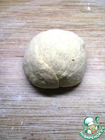 Смешать половину муки с солью, добавить воду с дрожжами, замесить тесто. Добавить к тесту капусту и сухой укроп, вымесить. Добавляя по чуть-чуть оставшуюся муку, замесить тесто. Выложить его в, смазанную маслом, миску, накрыть пленкой и оставить подниматься в теплом месте на 1,5-2 часа.