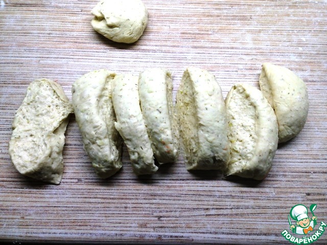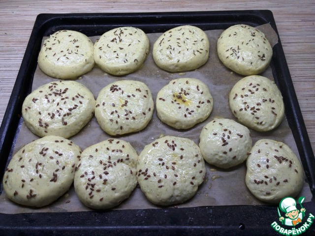 Кусочки оформить в круглые лепешки, не сплющивать (получается 13 булочек). Выложить на противень, накрыть полотенцем и дать подойти, еще полчаса. После булочки смазать взбитым яйцом и посыпать кунжутом или семечками. Я часть посыпала тмином, часть льняными семечками. Выпекать при 210-220С 20-25 минут, до золотистого цвета. А можно сформировать и выпечь один пирог-каравай.