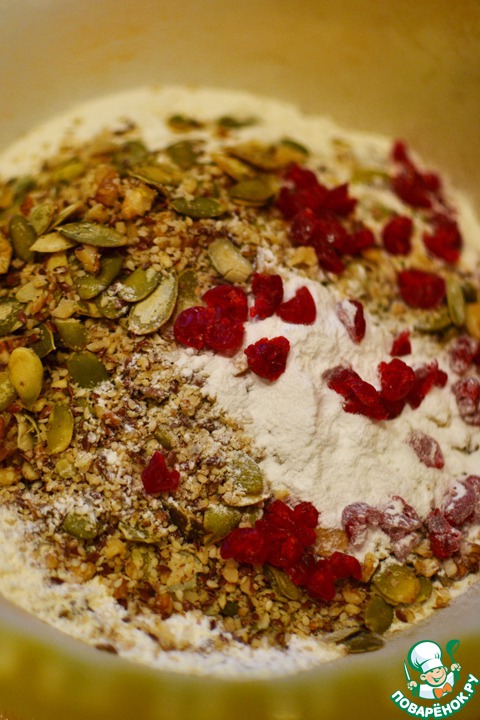 Муку просеять, добавить измельчённые овсяные хлопья, разрыхлитель, соль и все остальные наполнители (семена кунжута и льна, грецкие орехи, тыквенные семечки и вяленую или сушёную вишню.)