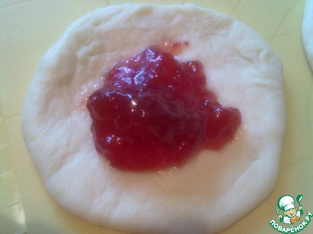Каждый кусочек теста раскатайте в тонкий пласт. На самый маленький кружочек теста на серединку кладем 1 чайную ложку клубничного джема, хорошо защипываем тесто и формируем шарик.