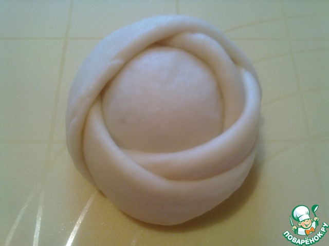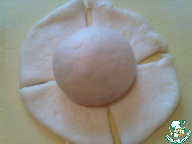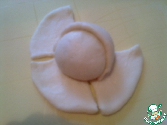 На кружочке большего размера делаем 4 надреза и на серединку кладем уже сформированный шарик с джемом.
