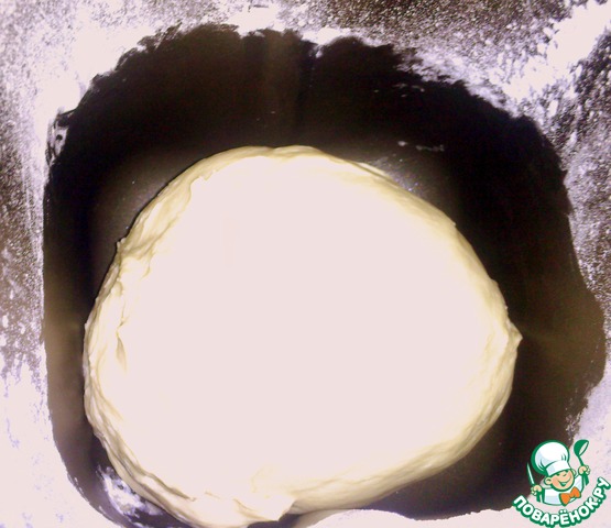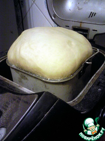 Дальше возможно два варианта приготовления теста: вручную или в хлебопечке. Суть от этого не меняется, но второй способ несравненно легче. Итак, в обоих случаях к полученной смеси добавить (не забудем перелить ее в посуду по-больше или чашу ХП) сахар, соль, дрожжи, яйцо и муку. Муку лучше добавлять постепенно, так как в зависимости от ее качества может уйти чуть больше или меньше. Замешиваем тесто. Я этот процесс доверила ХП, выставив режим "Тесто", он у меня длится 1 час 20 мин.