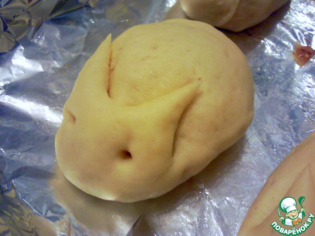 Делим тесто на 16-20 частей, размером примерно 5-7см. Формируем из каждой части теста булочки в форме тела кролика (чуть овальные шарики). И сразу выкладываем их на слегка смазанный маслом противень.