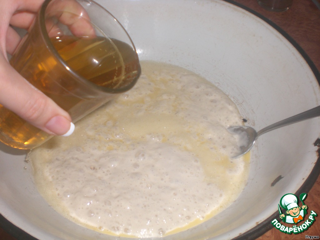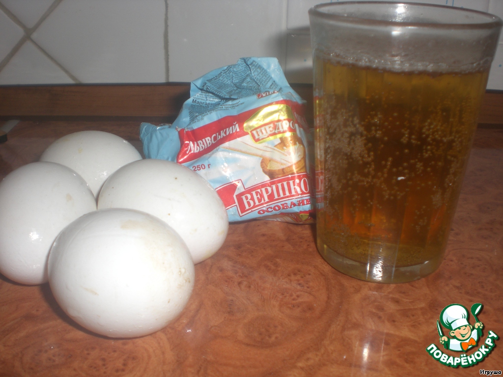 Когда опара подойдёт, растопим маргарин, взобьём яйца и приготовим стакан пива (не холодного)