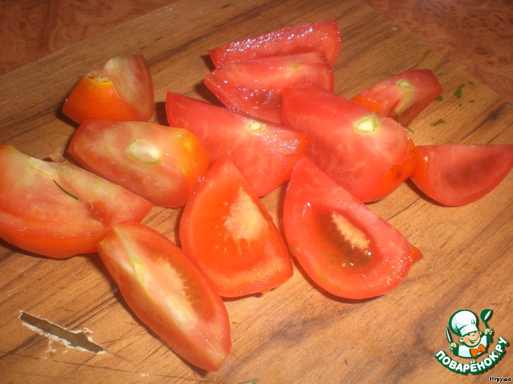 Помидоры вымоем и нарежем ломтиками, толщиной примерно 0,5 мм