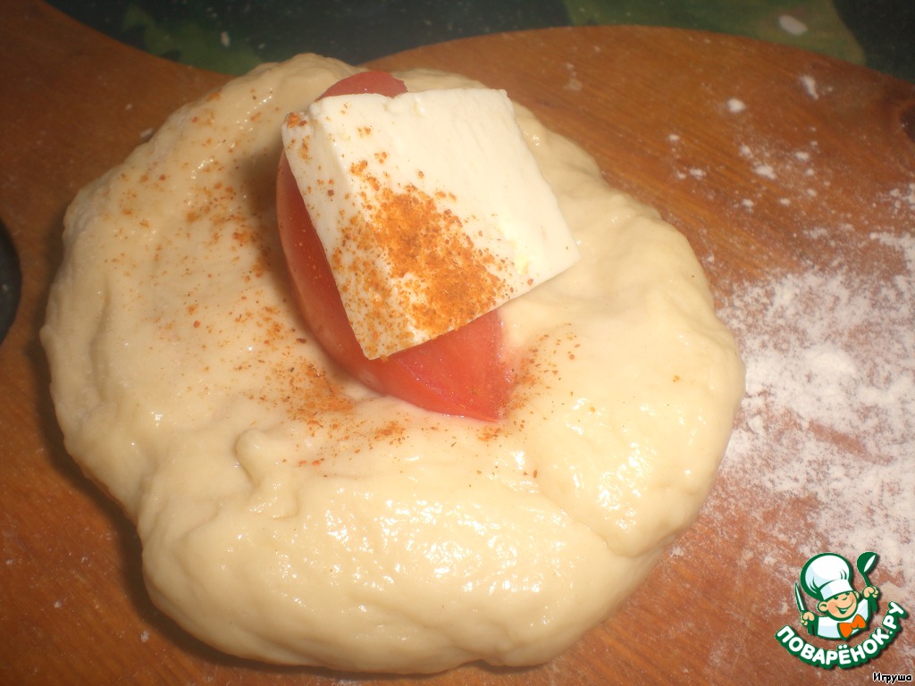 Подошедшее тесто обминаем, отрываем от него небольшие кусочки и формируем лепёшки. На каждую лепёшку кладём кусочек помидорки, брынзы и щепотку острого перца.