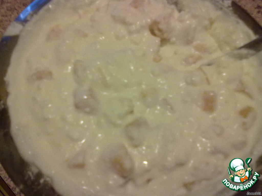 Творог, сахар, ванильный сахар, сметану перемешать. Персики нарезать на кубики, примерно, 0,5 на 0,5см. Все смешать тщательно. Добавить крахмал.