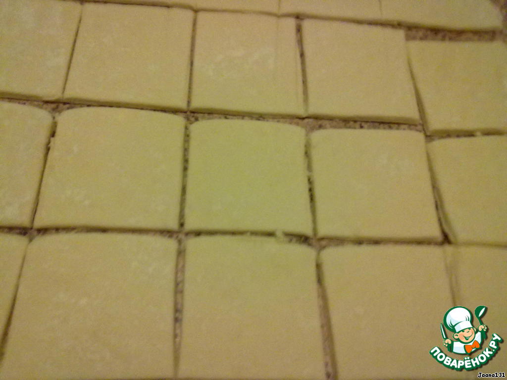 Включить духовку греться на 180 градусов. Достать тесто из холодильника. Раскатать его в квадратный пласт толщиной 0,5см.