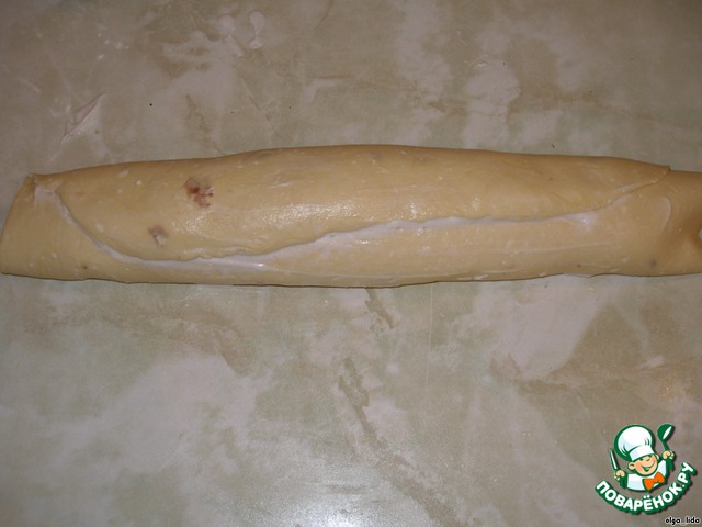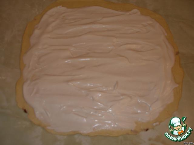 Тесто раскатать в прямоугольный пласт толщиной 2 см, смазать его взбитыми белками...