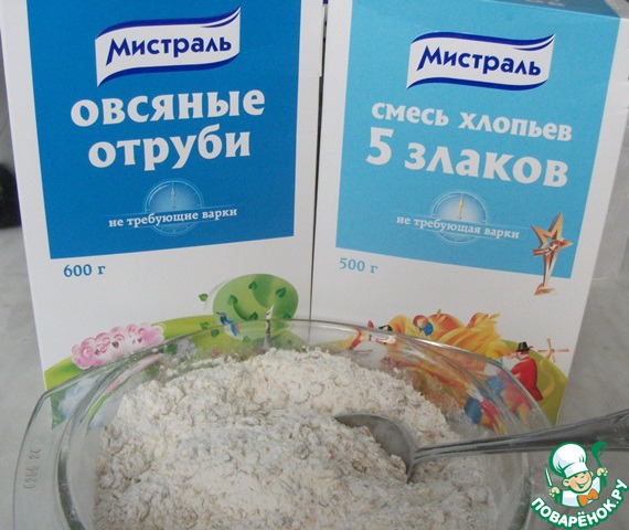 Начинаем с приготовления теста, его я замешиваю в хлебопечке, можно замесить и вручную. В миске смешиваем хлопья, муку, отруби, соль, сахар и дрожжи.