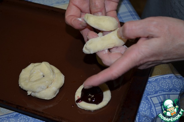 Раскатать круглую лепешечку, вырезать в середине круг. Положить начинку. Сверху из того теста, что осталось по краю скрутить "восьмерку" и положить на начинку.