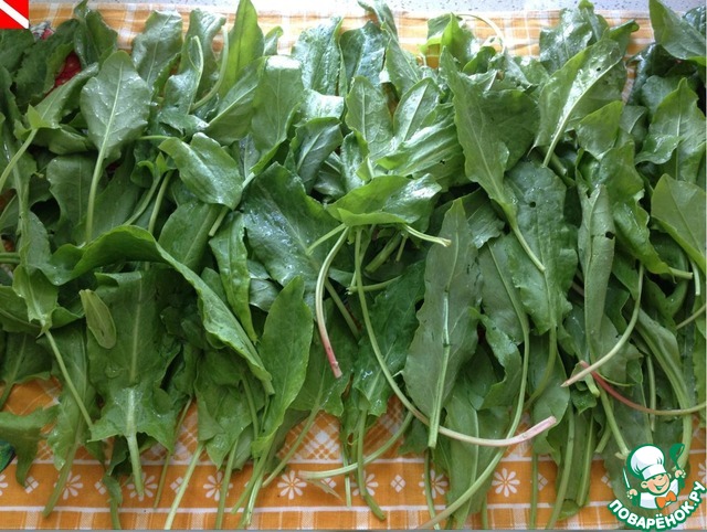 Начнем с начинки. Щавель я тщательно промываю и выкладываю на сухое полотеце - он у меня высыхает естесственным способом. На это уходит около часа. Очень важно, чтобы в момент нарезки щавель был абсолютно сухой - потом он не даст сок и изделие не будет подтекать.