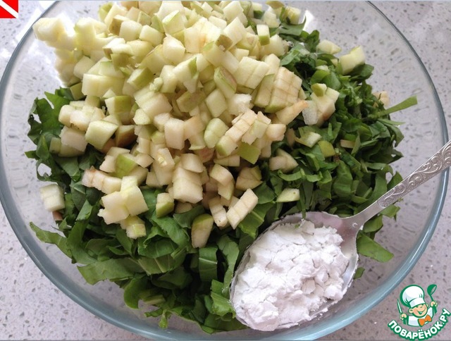 Вернемся к начинке. Щавель обсох, режем его, яблочко на меленькие кубики, добавляем крахмал (опять же, чтобы преотвратить утечку начинки).