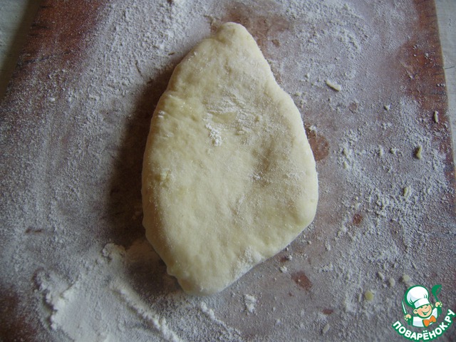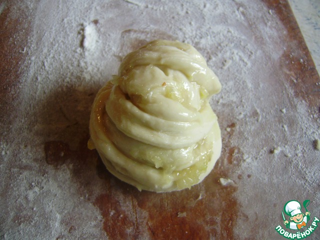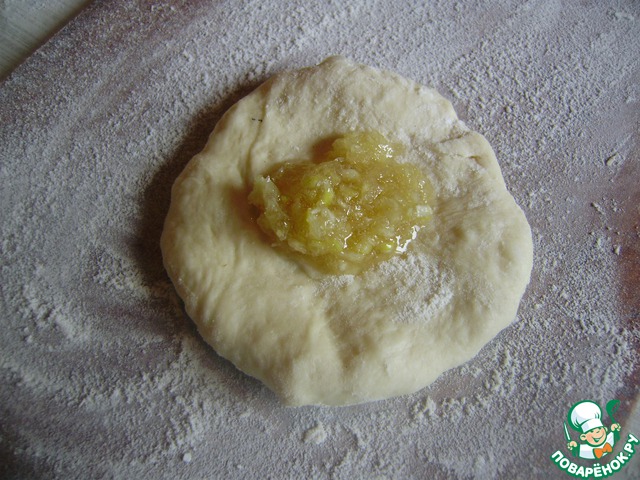 Берем одну часть теста и раскатываем, на середину выкладываем начинку.