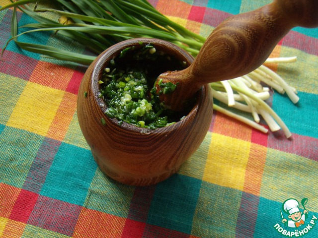 Пока наши пампушки в духовке, измельчим чеснок. Добавим щепотку соли и немного растительного масла и хорошо разотрем в ступке.