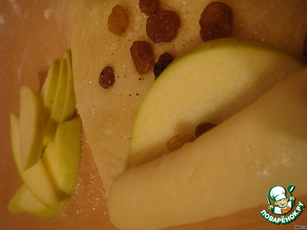 2 пласт смазываем маслом растопленным сливочным, посыпаем молотой корицей и посыпаем изюмом и сахаром.