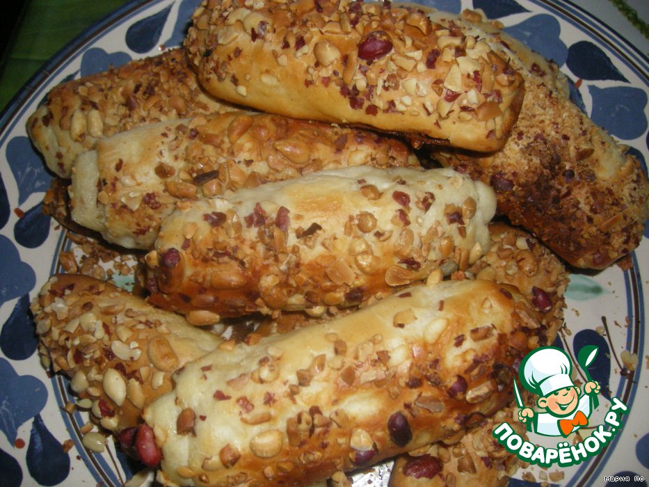 Яйцо взбить. Обмакнуть рулетик сначала в яйцо, затем в орехи. Выложить булочки на противень, оставить подняться (минут 15-20). Выпекать в духовке до готовности.