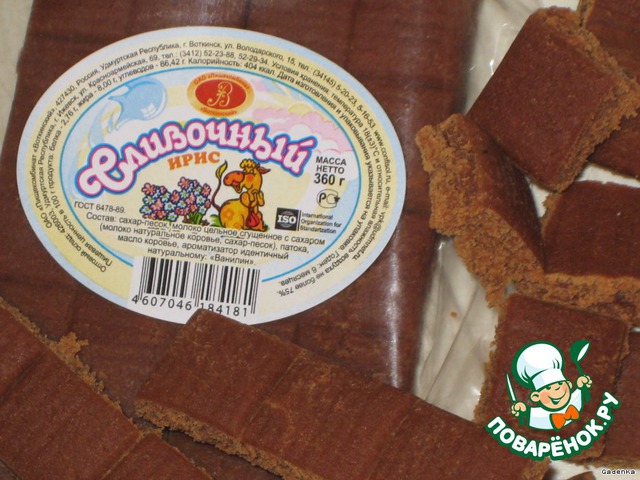 У меня был вот такой мягкий сливочный ирис, есть еще такой шоколадный. Поломать его на небольшие дольки.
