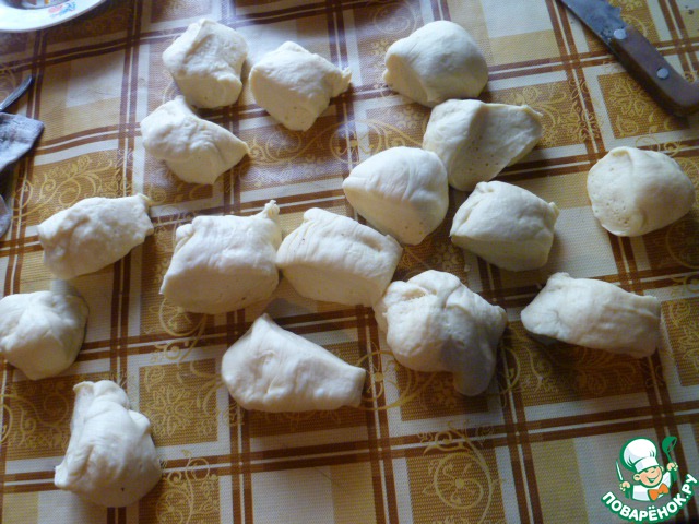 Я замешивала тесто в хлебопечке. Для тех, у кого ее нет, в теплом молоке растворить дрожжи и 2 ст. л. сахара. Подождать, пока дрожжи поднимутся и появится шапка. Яйца взбить с солью, добавить остальной сахар, взбить и добавить мягкое масло или жир. Влить молоко, водку и понемногу вмешать муку. Замесить мягкое тесто. Если тесто замешивать вручную, то может понадобиться чуть больше муки, где-то на полстакана. Дать ему подойти 1 час в теплом месте.