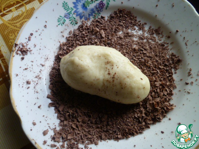 Берем кусочек теста, слегка его растягиваем и одной стороной вминаем в тертый шоколад.