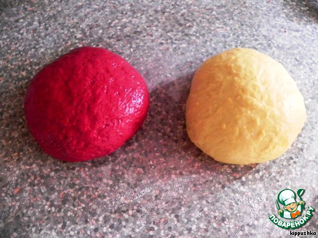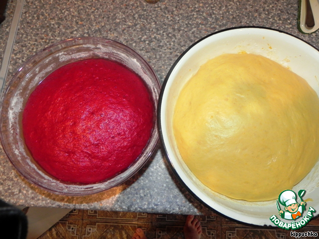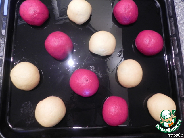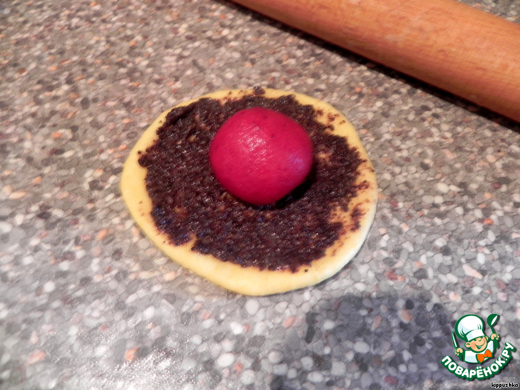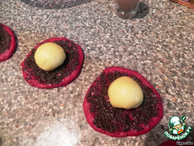 Приступим к формированию свекольно-тыквенных булочек. Раскатываем из тыквенного теста маленькие лепешки, из свекольного немного побольше. В тыквенную лепешку кладем изюм (по вкусу), а в свекольную мак...