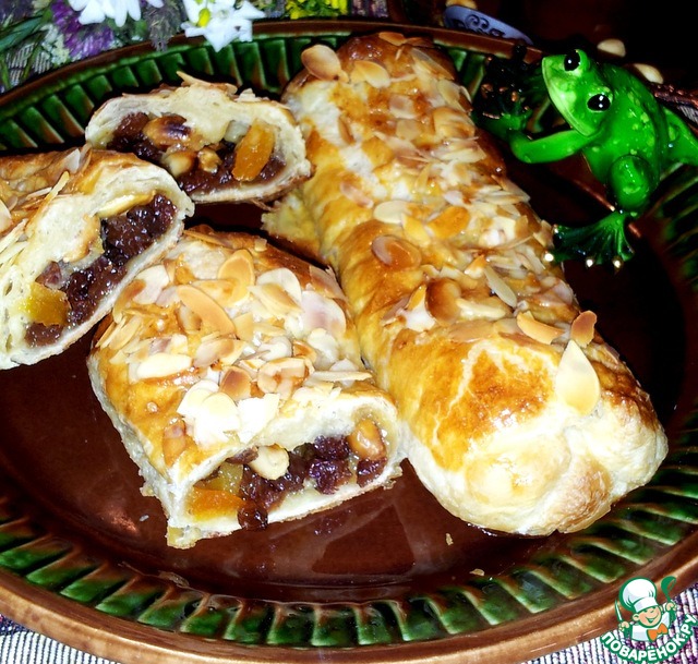 Ингредиенты - тесто, мёд, курага, изюм, орехи, лепестки, яйцо, ванилин.