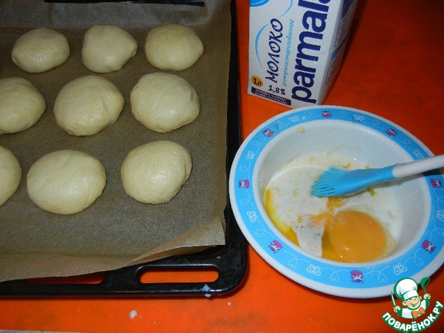Духовку разогреваем до 180 градусов. Противень застилаем бумагой для выпечки и выкладываем наши булочки швом вниз. Яичный желток смешиваем с оставшейся ложкой молока и смазываем наши булочки.