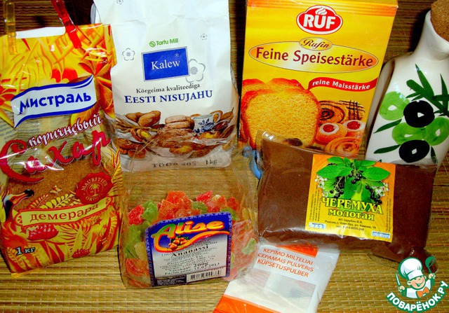 Черёмуха молотая, пшеничная мука, масло оливковое, сахар коричневый, кукурузный крахмал, ананасовые цукаты, разрыхлитель...
