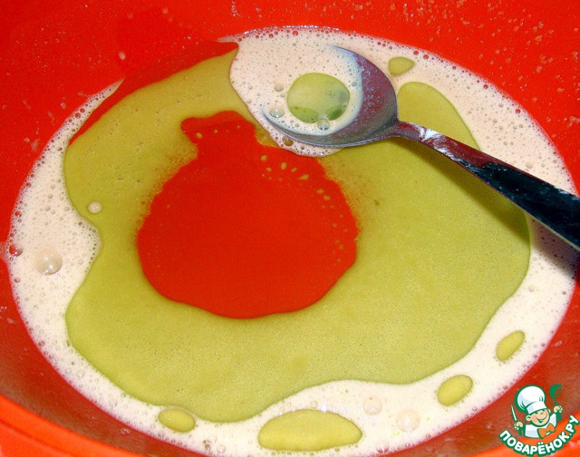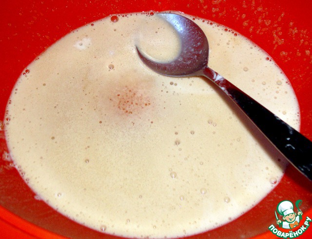 Налить воду в миску, высыпать сахар, разрыхлитель и хорошо размешать.