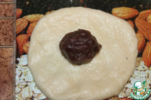Затем шарик расплющиваем ладонью, кладем в центр шарик пасты "Ан"