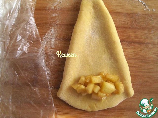 Перевернём получившийся треугольник песочным тестом вниз. Выложим начинку на широкий край теста.