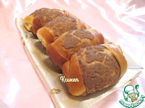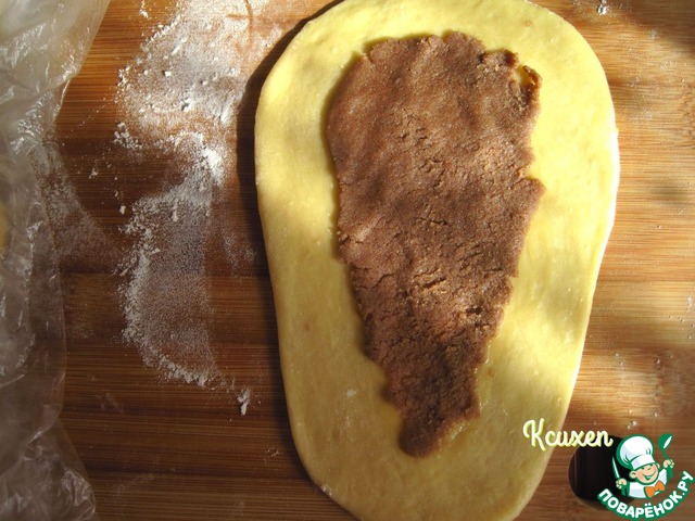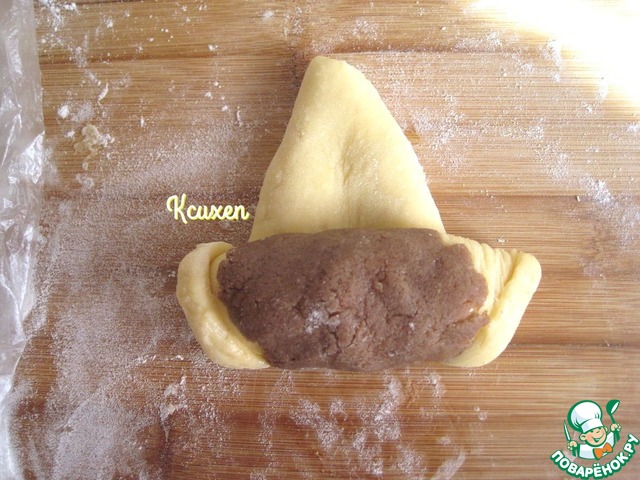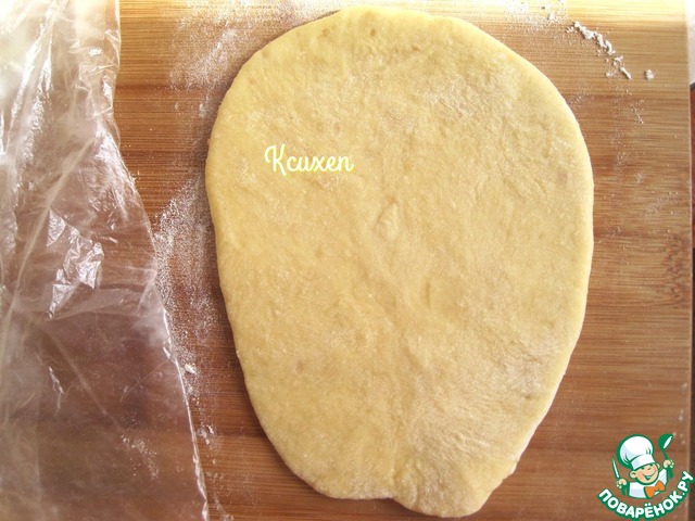 Каждый кусочек дрожжевого теста раскатываем в пласт, у которого верхняя сторона шире, чем нижняя (похоже на язычок).