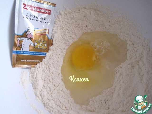 Для приготовления этого теста нужно почти сутки! Для дрожжевой опары: смешаем муку и сухие дрожжи "Саф-Момент, сделаем лунку, разобъём в неё яйцо, немного разболтав его, добавим тёплую воду. Замесим мягкое и липкое тесто для опары. Долго вымешивать не нужно.