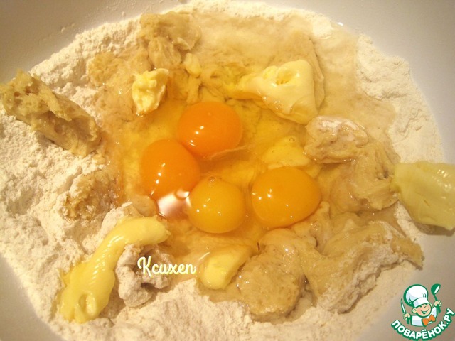 Для дрожжевого теста: в большой посуде смешаем муку, соль, сухие дрожжи и сахар. По оригинальному рецепту сахара нужно 180 грамм. Я положила 130-ть грамм. Добавим опару, нарезанную на кусочки, мягкое масло. В мучной смеси сделаем лунку, вольём разболтанные куриные яйца и тёплую воду.