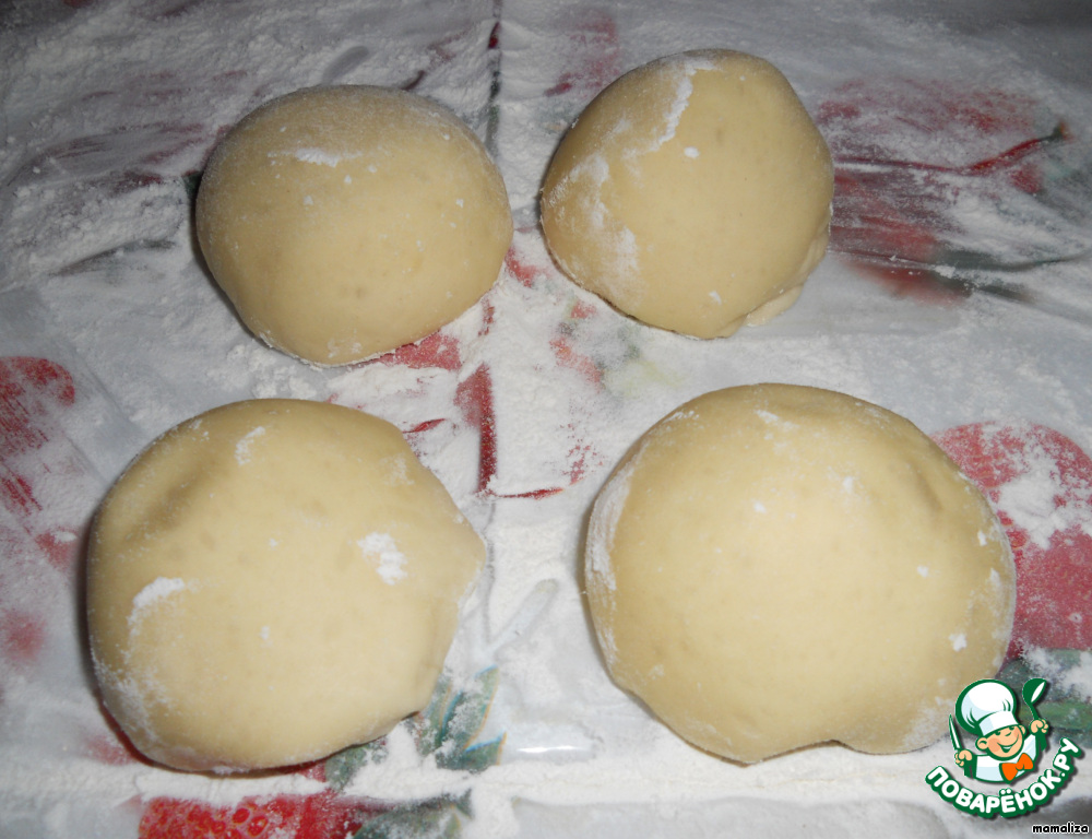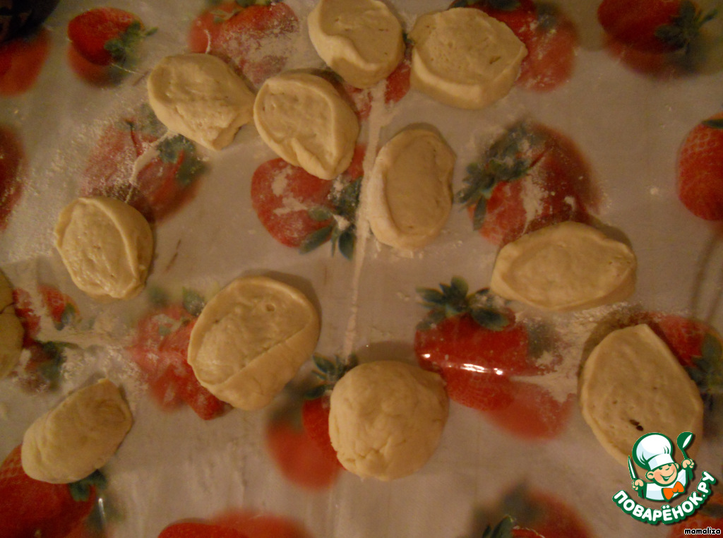 Тесто раскатать колбаской и нарезать небольшими (с грецкий орех) шайбочками.