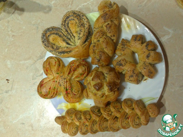 | На сайтах много разнообразных рецептов с такими булочками, но мне больше приглянулся данный рецепт. Нашла я его на сайте Кондитер, автор photografsasha. Мое семейство в восторге от этих булочек, уплетают за один раз, я не пожалела, что решилась их приготовить. Формы булочек я сделала разные, а их формирование я нашла в просторах всеми любимого интернета с разных источников. |